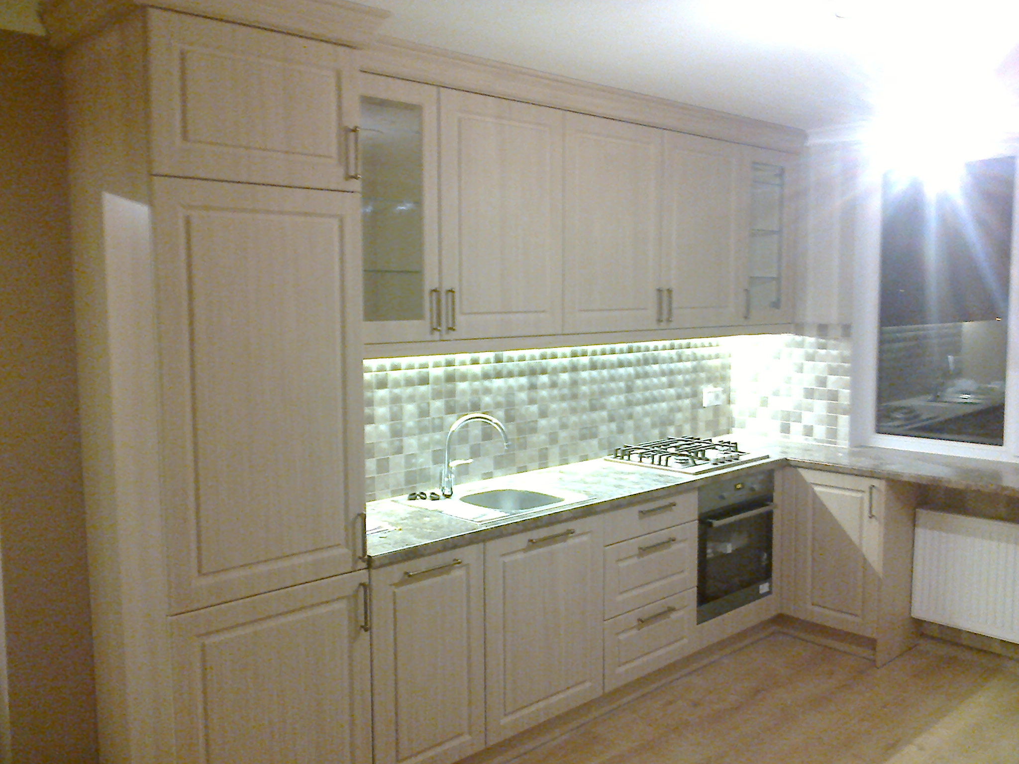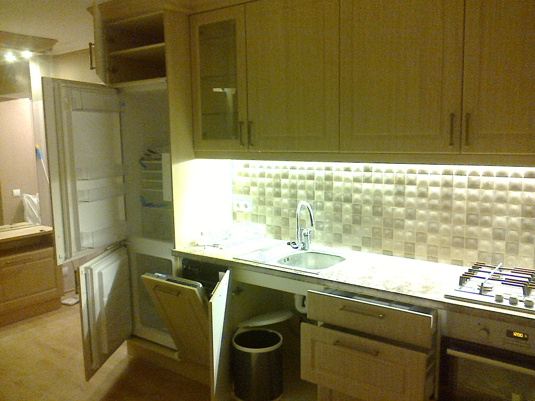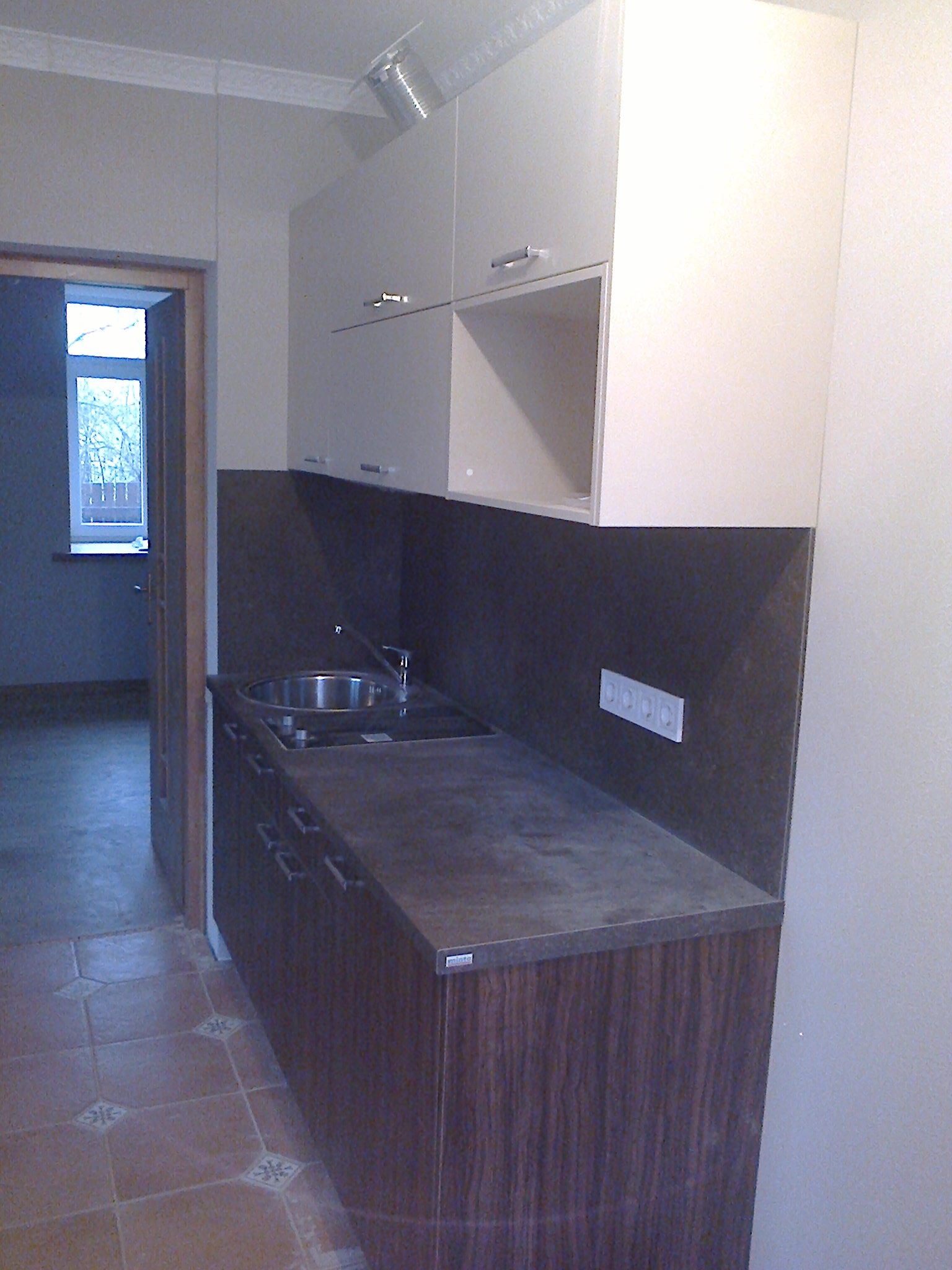 Saīsinot visu kārtību – ledusskapis, izlietne, darba zona, plīts.